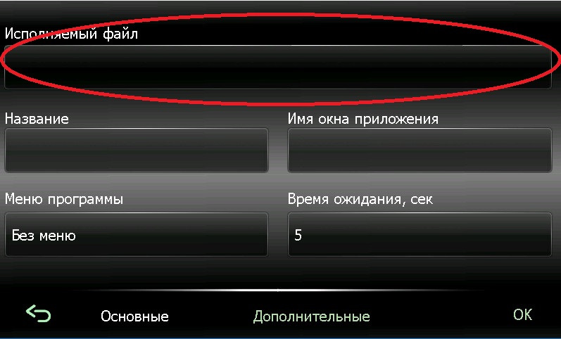 5. После выбора исполняемого файла произойдет возврат к окну, описанному в п.3 и вводим название ярлыка для программы навигации. Для этого нажимаем в область пустого поля с наименованием "Название". Появится экран с виртуальной клавиатурой на которой набираем имя будущего ярлыка. Например: navitel. После ввода имени нажимаем "ОК"