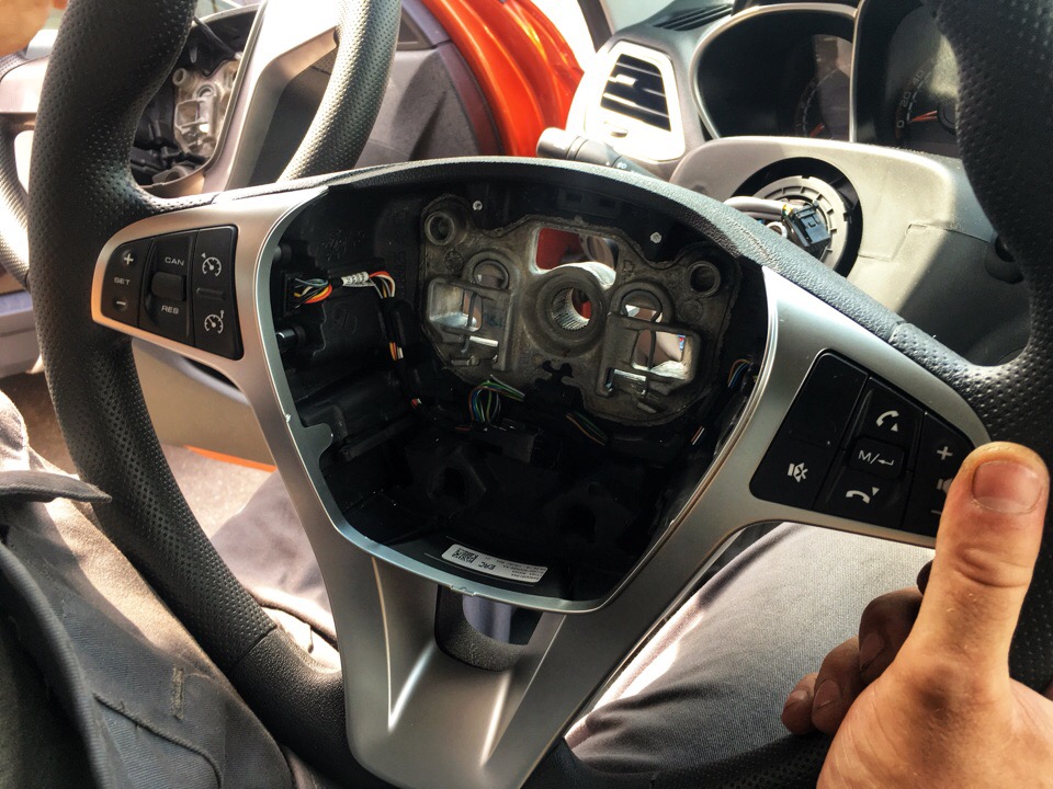 Теперь опишем сам процесс и технологию перетяжки руля более подробно. Начнем, наверное, с самого сложного и важного – это конечно, процесс снятия самого руля. Снять руль можно и на месте, НО лучше сделайте это самостоятельно, то есть прийти ЛУЧШЕ всего с рулем в руках. Под словом «самостоятельно» я подразумеваю прибегнуть к помощи специалистов. 10 минут и руль в целостности и сохранности у вас в руках. По факту это все же немного ювелирная работа, которую нужно выполнять аккуратно, что бы не повлечь за собой дополнительные затраты и массу проблем.
