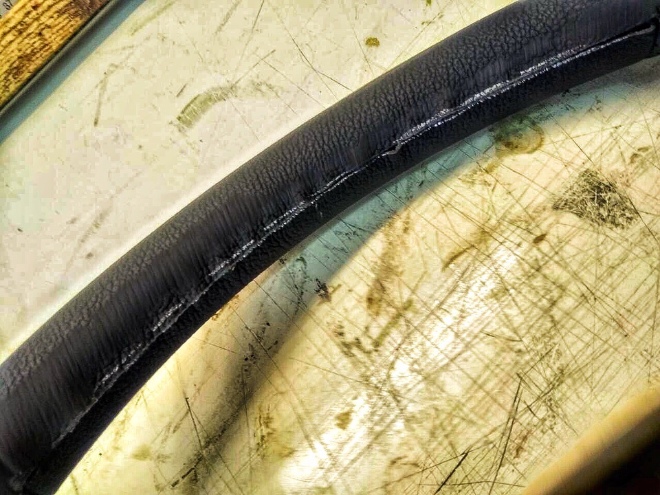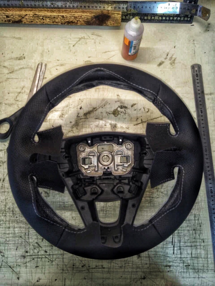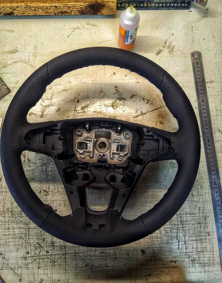 Далее– натяжка и поклейка новой кожи (экокожи) на обод руля