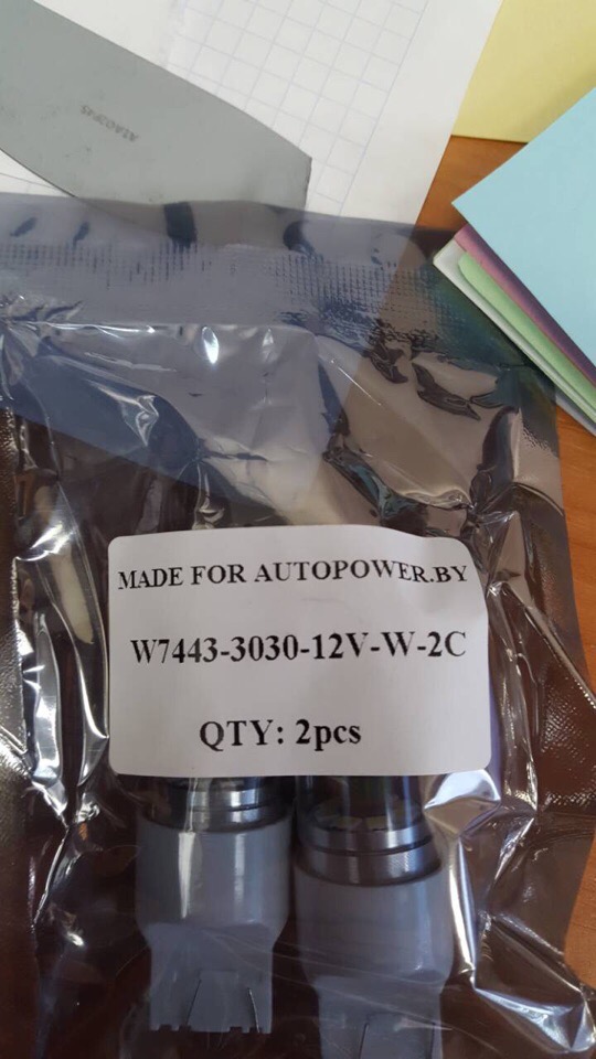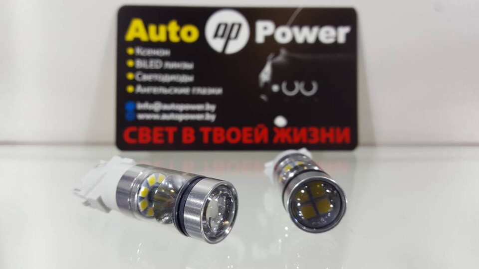 Ну и на последок, замена штатных галогеновых лампочек в ДХО/габариты – светодиоды AutoPower на самсунг чипах 2ух контактные, цоколь 7443. Плюсом светодиода является наличие линзы, которая непосредственно фокусирует свет вперед.